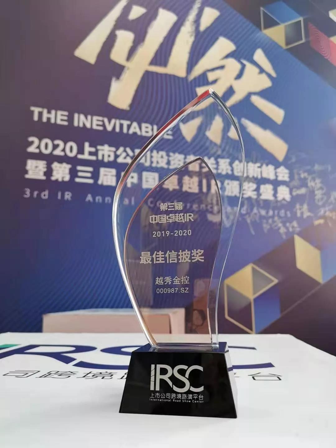 2020年上市公司投资者关系创新峰会暨第三届中国卓越 IR 颁奖盛典在深圳举办,越秀金控(000987.SZ)信披团队凭借专业合规的信息披露,真诚透明的投资者关系管理,荣获第三届中国卓越IR“最佳信披奖”。