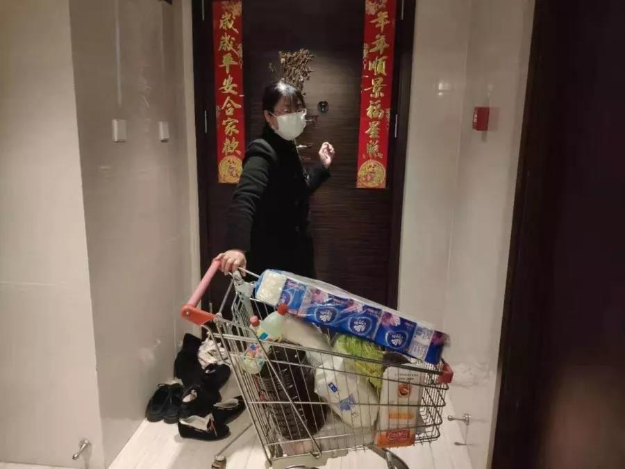 采购的“仗”可不止在排队,每日早上生鲜超市大概要排45分钟左右才能进场,她和小伙伴们分工合作、按清单拣货买单,没有机动车可帮忙,她们就推着超市的购物车回到小区进行分装,业主方便下楼拿的、她们就给存着;老人家和在家隔离的业主们,她们都亲自将肉菜、家居用品还有不便拿的快递,一块送到家门口。上午整套采购流程下来,要花3-4小时的时间。